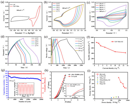 - Wang, J.; Li, S.; Zhu, Y.; Zhai, S.; Liu, C.; Fu, N.; Hou, S.; Niu, Y. Metal-organic frameworks-derived NiSe@RGO composites for high-performance asymmetric supercapacitors. J. Electroanal. Chem. 2022, 919, 116548. [Google Scholar] [CrossRef]