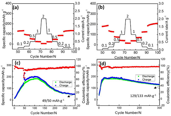 Comparison of cycle performance for HMoOx−Zn. (a,b) Rate performance at 0.1 A g−1, 0.2 A g−1, 0.5 A g−1, 1.0 A g−1, and 2.0 A g−1 for the bare Zn||γ−MnO2 full cell and HMoOx−Zn||γ−MnO2 full cell, respectively. (c,d) Cyclic stability for the bare Zn||γ−MnO2 full cell and HMoOx−Zn||γ−MnO2 full cell at 0.1 A g−1, respectively (The red curve represents the corresponding coulomb efficiency).