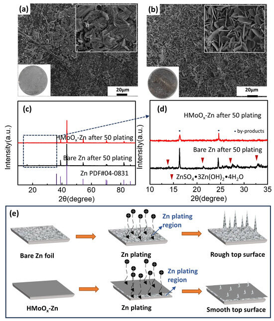 The characterizations of bare Zn and HMoOx−Zn in the plating/stripping process are examined in Figure 8. SEM imaging was utilized to investigate the morphological changes in both electrodes following various states of stripping and plating, as presented in Figure 8a,b. After 50 cycles, it was obvious that the bare Zn plate exhibited an abundance of dendrites that may have developed and partially breached the separator, while the homogeneous deposition layer on the surface of HMoOx−Zn appeared to consist primarily of densely packed flake−like products. We speculated that the dense phase observed atop the HMoOx layer comprised deposited zinc metal, and the irregular flakes were determined as sulfate by−products. The XRD patterns of the bare Zn and HMoOx−Zn after 50 cycles are displayed in Figure 8c. It can be observed that the crystalline structures of both electrodes had no notable discrepancies, indicating that zinc plating and stripping were the predominant electrochemical reactions detected throughout the cycling process. However, several newly emerged diffraction peaks of the two electrodes corresponded to ZnSO4·3 Zn(OH)2·4 H2O in Figure 8d, illustrating that side reactions, such as corrosion and hydrogen evolution, took place in both anodes during cycling [52]. Moreover, the protective layer can promote uniform Zn deposition, and this reduction in dendrite growth consequently decreased the by−products associated with dendrite formation; therefore, the peaks of Zn by−products in the modified Zn anode were lower than those in the bare Zn. Based on the preceding experimental characterization, it could be inferred that the presence of the HMoOx layer substantially impeded dendrite growth and reduced the incidence of side reactions. In addition to its wettability, the total performance was improved. However, zinc dendrites grew vigorously on bare zinc foil without any protective measures because of the impact of the tip effect, as displayed in Figure 8e. Hence, the presence of the HMoOx layer aided in safeguarding the zinc anode by inducing uniform deposition of Zn2+ and facilitating Zn2+ migration.
