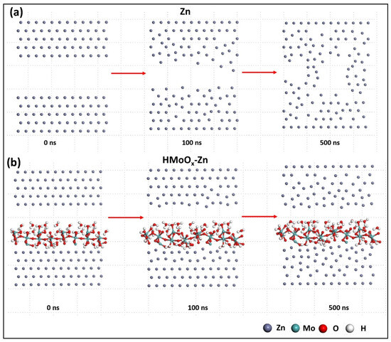 In order to further illustrate the importance of the HMoOx coating, we performed two sets of molecular dynamics simulations for the surfaces of the HMoOx−Zn and Zn anodes. Figure 9a,b show the surface structures of both the Zn and HMoOx−Zn anodes in the range of 0–500 ns, respectively. The presence of HMoOx suppressed the growth of Zn dendrites by forming a protective layer by interacting with Zn ions and preventing unstable reactions in localized regions. This inhibition potentially helped maintain surface uniformity and reduced dendrite formation. Additionally, HMoOx may have formed a barrier layer on the surface of the Zn anode, impeding the free migration of Zn ions. This barrier layer effectively slowed down the rate of dendrite expansion. The results of these simulations were consistent with the above experimental outcomes, which fully demonstrated the protective role of the HMoOx layer on the performance of the Zn anode.