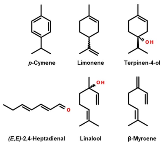 Marquez and his team previously showed that the key aroma compounds in I. paraguariensis leaves were hexadecane, linalool, geranyl acetone, and (E,E)-2,4-heptadienal [17], while Kaltbach et al. proved that the key compounds in Yerba Mate were linalool, eucalyptol, limonene, decanal, and pinene [18].