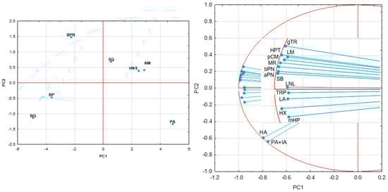 Principal component analysis of Ilex taxons (PC1 vs. PC2) based on the contents of its volatile organic constituents; AM—I. aquifolium Aurea Marginata, BG—I. meserveae Blue Girl, BP—I. meserveae Blue Prince, BPR—I. meserveae Blue Princess, HNS—I. aquifolium Handsworth New Silver, PA—I. paraguariensis, SQ—I. aquifolium Silver Queen; aPN—α-pinene, bPN—β-pinene, gTR—γ-terpinene, HA—hexanoic acid, HPT—(E,E)-2,4-heptadienal, HX—hexanal, LA—linalyl acetate, LM—limonene, LNL—linalool, mHP—6-methyl-hept-5-en-2-one, MR—myrcene, PA+IA—pentanoic acid + isoamyl acetate, pCM—p-cymene, SB—sabinene, TRP—terpinen-4-ol.