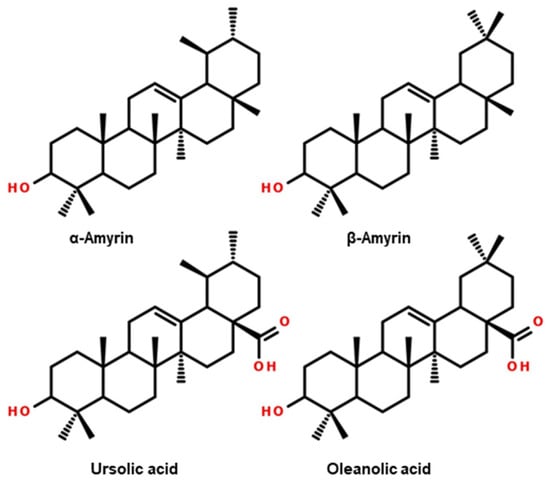 Analysis of the profiles of higher terpenoids and sterols in Ilex leaves showed the presence of 11 compounds (presented in Table 2). For the European cultivars, the study showed similarities in the terpenoid profiles. The dominant compounds (whose chemical structures are shown in Figure 3) in I. aquifolium and I. meserveae were ursolic acid (10.7–13.3 mg g−1), oleanolic acid (3.1–5.1 mg g−1), α-amyrin (0.7–2.6 mg g−1), lupeol (0.2–0.8 mg g−1), and uvaol (0.2–0.7 mg g−1). Compared to the European varieties, the leaves of I. paraguariensis, which were used as a reference sample, had significantly lower contents of the compounds mentioned above. In particular, an approximately 3× lower content of oleanolic acid (1.54 mg g−1) and about 2× lower content of α-amyrin (0.4 mg g−1) were identified.