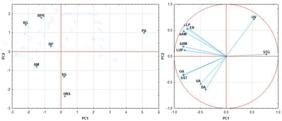 Principal component analysis of Ilex taxons (PC1 vs. PC2) based on the contents of its higher terpenoid constituents; AM—I. aquifolium Aurea Marginata, BG—I. meserveae Blue Girl, BP—I. meserveae Blue Prince, BPR—I. meserveae Blue Princess, HNS—I. aquifolium Handsworth New Silver, PA—I. paraguariensis, SQ—I. aquifolium Silver Queen; aAM—α-amyrin, BA—betulinic acid, bAM—β-amyrin, bST—β-sitosterol, ER—erythrodiol, LP—lupeol, LUP—lup-20(29)-ene, OA—oleanolic acid, STG—stigmasterol, UA—ursolic acid, UV—uvaol.