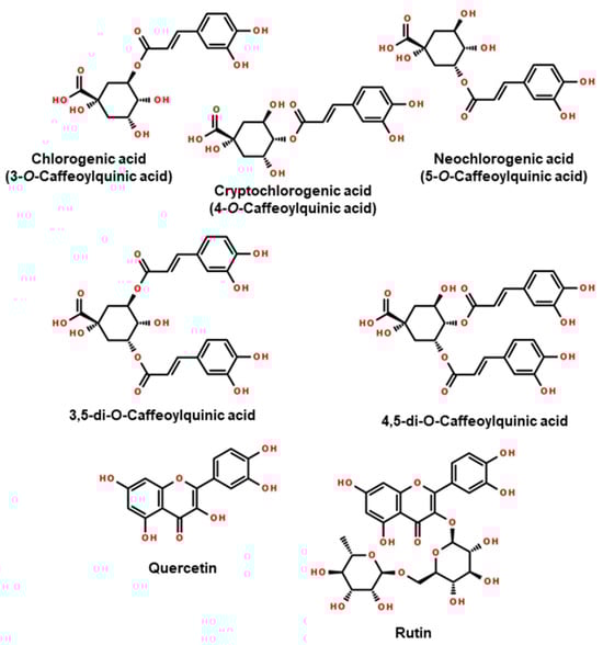 Our research on phenolic acid and polyphenol fractions identified 12 compounds (Table 3). Quantitative differences in content were demonstrated between European varieties of I. aquifolium and I. meserveae and the Argentinian variety I. paraguariensis. For the world-famous Yerba Mate, the compounds with the highest content were 3,5-di-O-caffeoylquinic acid (18.1 mg g−1), chlorogenic acid (13.5 mg g−1), neochlorogenic acid (7.5 mg g−1), and 4,5-di-O-caffeoylquinic acid (6.1 mg g−1). European varieties, on the other hand, had significantly higher contents of chlorogenic acid (17.5–39.0 mg g−1), neochlorogenic acid (5.7–21.6 mg g−1), cryptochlorogenic acid (3.8–9.5 mg g−1), and rutin (5.1–11.8 mg g−1). On the other hand, these varieties had lower contents of 3,5-di-O-caffeoylquinic acid (1.3–7.4 mg g−1) and 4,5-di-O-caffeoylquinic acid (0.6–3.4 mg g−1). The chemical structures of the major compounds are shown in Figure 5.