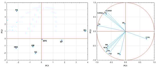 Principal component analysis of Ilex taxons based on the contents of its polyphenol and phenolic acid constituents; PA—I. paraguariensis, AM—I. aquifolium Aurea Marginata, SQ—I. aquifolium Silver Queen, HNS—I. aquifolium Handsworth New Silver, BP—I. meserveae Blue Prince, BG—I. meserveae Blue Girl, BPR—I. meserveae Blue Princess; RT—rutin, QA—quinic acid, FA—ferulic acid, CA—citric acid, MA—malic acid, QR—quercetin, CCHL—cryptochlorogenic acid, NCHL—neochlorogenic acid, CHL—chlorogenic acid, 3,5DQA—3,5-di-O-caffeoylquinic acid, 4,5DQA—4,5-di-O-caffeoylquinic acid.