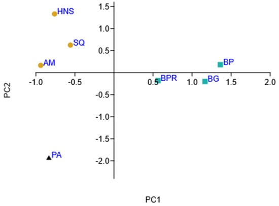 Principal component analysis of Ilex taxons (PC1 vs. PC2) based on saponin content; AM—I. aquifolium Aurea Marginata, BG—I. meserveae Blue Girl, BP—I. meserveae Blue Prince, BPR—I. meserveae Blue Princess, HNS—I. aquifolium Handsworth New Silver, PA—I. paraguariensis, SQ—I. aquifolium Silver Queen.