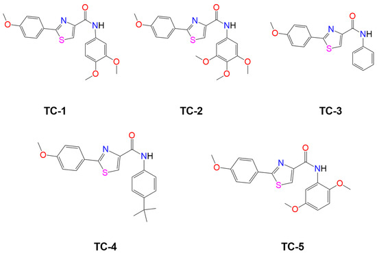 The Thiazole carboxamide series TC-1-TC-5 was previously synthesized as outlined in Scheme 1. The coupling reaction to form these derivatives was afforded by using EDCI and DMAP as activating agents and covalent nucleophilic catalysts, respectively [26].