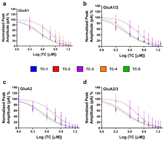 The IC50 values were examined using GraphPad Prism software 9.5.0.730 (x64) (Table S6), which confirmed these findings. The IC50 values of TC substances were calculated by standardizing the peak current amplitudes using data obtained from 8–10 cells. Following a 500 ms exposure to the compounds, the cells were rinsed with glutamate for 20 s. Next, a solution containing just glutamate at a concentration of 10 mM was administered, and the resulting immediate induced electrical current was measured and documented (Figure 3). Results revealed that TC-2 pronounced inhibitory impact on GluA2, GluA2/3, GluA1/2, and GluA1 at low micromolar concentrations (3.02 µM, 3.04 µM, 3.1 µM, and 3.20 µM, respectively). Particularly noteworthy was TC-2′s superior efficacy in suppressing AMPAR currents. For instance, the IC50 for GluA2 was estimated at 3.3 µM when treated with TC-1 and 3.35 µM with TC-5, as depicted in the dose–response curve (Figure 3). Detailed IC50 values for all TC compounds are provided in Table S6.