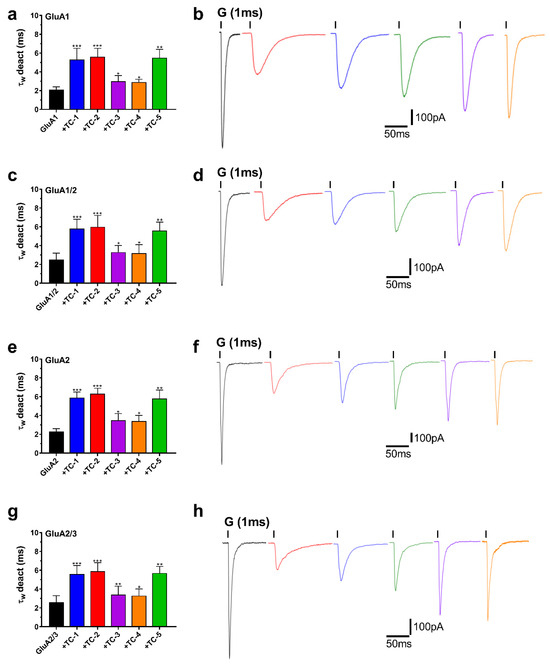 TC compounds modulate AMPA receptor desensitization rates. The graphical breakdown highlights their effects on specific subunits: (a,b) depict the impact on GluA1 desensitization, (c,d) focus on GluA1/2, (e,f) demonstrate interactions with GluA2, and (g,h) detail the modulation of GluA2/3. Notably, the distinct traces in (b,d,f,h) reveal significant alterations induced by the TC-1–5 series on AMPAR desensitization patterns. Throughout the experiments, whole-cell currents were recorded at −60 mV under pH 7.4 conditions at 22 °C. (*) indicates p value < 0.05, (**) for p < 0.01, and (***) for p < 0.001, while “ns” denotes non-significant results.