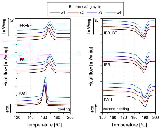 Cooling (a) and second heating (b); DSC thermograms measured for PA and its composites subjected to multiple reprocessing.