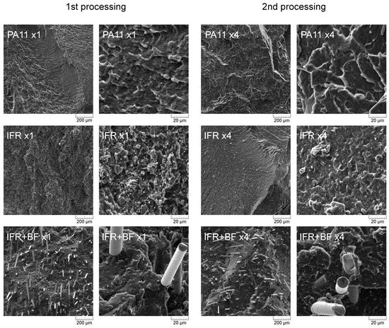 SEM images of brittle fractured cross-section structures of injection-molded samples taken in two magnifications after the first and fourth processing cycles are presented collectively in Figure 2. Both PA11 series (x1 and x4) show the features of a typical semicrystalline fracture with a developed fracture surface. The fracture surface observed at higher-magnification SEM images is much more complex for all series in the first processing cycle (marked with index x1), indicating plastic deformation dominated the fracture mechanism. The smoother surface of the reprocessed samples may be correlated with the increased crystallinity, as was discussed by Park et al. [35], and is correlated with a different toughness of the samples. Repeated processing resulted in the beneficial effect of homogenizing the structure of the dispersed flame retardants, which is especially visible in images taken at a higher magnification. After the fourth technological process, the IFR+BF series is characterized by a shortening of the fibers present in the matrix and an increased number of pull-out holes. Those effects may be related to the partial degradation of the silane coating on the surface of the basalt fibers [36,37] or the reduction in the interphase surface area resulting from the shortening of the fibers and, thus, with an increased susceptibility to pull-out during external loads, causing breakage [38]. However, considering the observations of the polymer–basalt fiber interfacial area in SEM images taken in higher magnification, it is possible to emphasize the lack of gaps and detachments of the fiber from the matrix, which shows proper interphase adhesion. What is most important in the discussed microstructure analysis, both for IFR and IFR+BF, is that reprocessing did not result in any noticeable presence of pores, which could be caused by the thermal decomposition of flame retardants or the degradation of the polyamide matrix itself.