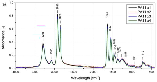 Changes in the chemical structure of polyamide and the reprocessed polyamide composites were assessed using FTIR-ATR. In Figure 3, FTIR spectra of all material series are presented, and absorption bands characteristic of PA11 are observed, namely N-H stretching strong band (3295 cm−1), NH groups weak band (3080 cm−1), CH2 asymmetric stretching (2918 cm−1), CH2 symmetric stretching (2850 cm−1), Amide I, C=O stretching (1635 cm−1), Amide II, C-stretching and C=O in-plane bending (1542 cm−1), CH2 asymmetrical bending (1462 cm−1), N-H deformation (1436 cm−1), CH2 symmetrical bending (1369 cm−1), Amide III-NH-O stretching (1277 cm−1), interaction between NH bending deformation and O=C-N stretching (1157 cm−1), Amide IV-C-C(O) stretching mode (938 cm−1), and CH2 rocking and C=O deformation (719 cm−1) [39,40,41,42]. Based on the spectroscopic analysis, it can be assumed that no significant changes in the chemical structure of the polymer matrix occur in the case of unmodified PA11 due to the reprocessing of the material. The spectra of the consecutively processed polymer series showed no additional peaks or shifting.