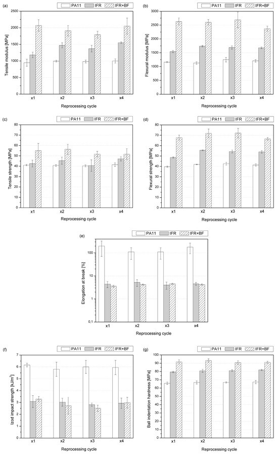The mechanical properties of PA11 modified with IFRs and additionally reinforced with basalt fiber, subjected to four-time melt processing, are summarized in Figure 4. The comprehensive analysis included the determination of the tensile/flexural strength, the elastic modulus and elongation at break in the static tensile (a,c,e) and bending (b,d) tests, the determination of impact strength using the Izod method (f), and the ball indentation hardness (g).