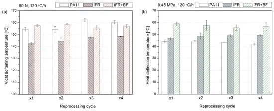 Thermomechanical properties of reprocessed polyamide; VST (a) and HDT (b).