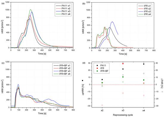 HRR vs. time curves (a–c) and relative changes in pHRR and THR caused by successive reprocessing cycles (d).
