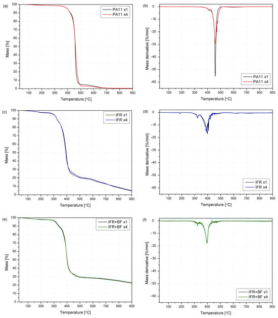 TG and DTG curves for PA11 (a,b), IFR (c,d), and IFR+BF (e,f) after the first and fourth processing.