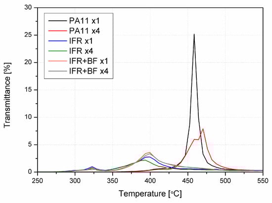 During the thermal analysis, exhaust gases were continuously analyzed via infrared spectroscopy. Figure 8 shows the Gram–Schmidt profile for the different samples. It was found that only one peak appeared for unmodified PA11, corresponding to the degradation of PA11 at about 460 °C. For the remaining samples, it is appreciated that there are mainly two stages, coinciding with the two steps of the degradation, one at about 320 °C (for the sublimation of melamine) and another one at about 400 °C, corresponding to the major mass loss. As the diagram for materials does not change due to reprocessing, only the curves for the first processing are shown. The achieved transmittance for neat PA11 is much higher than for the materials with IFRs, and as observed from TGA, the degradation takes place at higher temperatures. However, the matrix’s degradation occurs at a lower rate for those materials (IFR, IFR+BF) in a lower but broader range of temperatures, thus explaining the lower transmittance achieved for those samples. Moreover, this effect may be related to the lower content of PA in the modified material series.