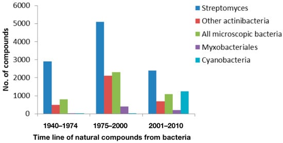 The period between 1940 and 1980 was recognized as the golden age of drug research, as several drugs were discovered in this era, like antibacterial, antifungal, antiviral, anticancer, antidiabetic, hypercholesterolemia, immunosuppressants, etc. [1,2,3]. In addition to their clinical utility, natural products are invaluable sources for nutrition [4], pigments as natural colors [5], and cosmetics [6]. The advancement of basic biological research to understand health and various diseases [7,8,9] led to the discovery of druggable natural compounds (NCs) from microbes. During the drug discovery era, around 200–300 NCs/year were found, and in the late 1970s, the rate was enhanced to ≈500 NCs/year. After the 1980s, the rate of drug discovery slowed down as it became harder to identify novel and useful NCs from the microbes (Figure 1).