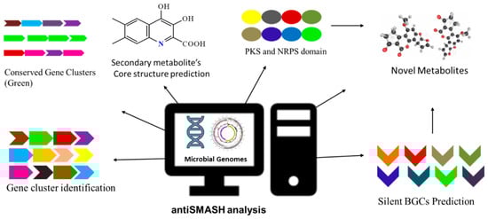 Nowadays, several bioinformatics tools are available that are helpful in genome mining for silent BGCs from potent microbes [61]. To perform the bacterial genome mining, we first need the desired genome sequence of the interested microorganism. Bacterial genome sequences can be downloaded from authentic online centers, e.g., the national center for biotechnology information (NCBI) database (http://www.ncbi.nlm.nih.gov) and the Joint Genome Institute (JGI) database (http://jgi.doe.gov), in the form of GenBank, EMBL, or FASTA files. Once the genome sequence is obtained, the gene clusters associated with the biosynthesis of a secondary metabolite can be identified and characterized by using different bioinformatics tools [62,63].