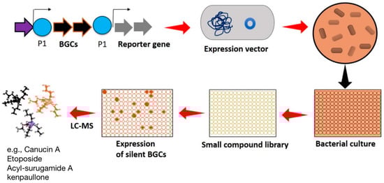 Using the recent bioinformatics tools, more detailed analysis of the BGCs revealed that the bacterial genome contains a trove of silent or cryptic BGCs [46,47,48,49], which are not expressed during normal growth conditions in the laboratory [46]. Indeed, the expression of a large part of microbial BGCs varies with specific environmental or cultural conditions [50]. Recent studies in genome mining have disclosed that microbial genomes comprise a large number of obscure silent BGCs [44,45]. This shows that the bacterial genome contains a trove of silent BGCs, and that could be a gold mine for novel drug discovery. Therefore, in order to identify novel NCs from the silent BGCs, this review paper discusses a strategic workflow comprised of the latest strategies and techniques that enable the high-throughput fashion screening of novel NCs from bacterial species.