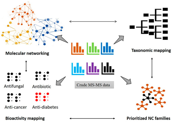 To assist the rapid screening of NCs, dereplication procedures usually consider the combination of various separation strategies, spectroscopy, and database searching methods [119]. The dereplication of NCs can be achieved best with the help of a computer-based strategy called molecular networking (MN). The MN-based dereplication comprised the visualization and interpretation of complex MS/MS data for the rapid identification of the known compounds and molecular networking of the unknown mass spectra in crude MS/MS data [122]. The MN consists of two crucial steps, i.e., (1) organization and visualization of MS/MS datasets and (2) automation in database search. The key strategies for MN-based dereplication include the following: (1) integration of MS data; (2) harnessing mass shift differences; and (3) integration of functional annotation. The integration and visualization of tandem MS data are being achieved based on the similarity of the spectral map. For structurally similar compounds, nodes of similar fragmentation spectra would cluster together and generate the cluster of analogues [123]. The MN utilizes the harnessing of mass shift differences and exploits mass-to-charge (m/z) ratios between related molecules [122]. This strategy facilitates the profiling of meta-mass shift chemicals that allow the identification of known chemical groups and reveal the specific biochemical transformation [124].