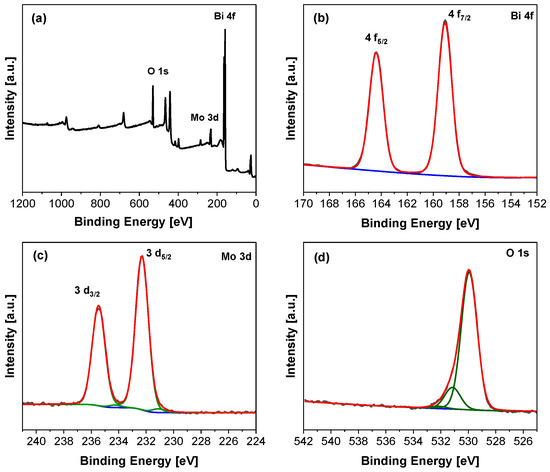 The near-surface elemental composition and the oxidation state of surface elements were analyzed using X-ray photoelectron spectroscopy (XPS). As shown in Figure 3a, Bi, Mo, and O elements were found to have strong characteristic peaks in the survey spectrum of the BMO-400 (EG) sample. The high-resolution XP spectrum of Bi 4f (Figure 3b) shows peaks located at 164.3 eV and 159.1 eV, which are ascribed to Bi 4f5/2 and Bi 4f7/2 and correspond to the +3 oxidation state of Bi [62]. Moreover, the Mo 3d spectrum presents peaks at binding energies of 235.5 eV and 232.2 eV that are attributed to Mo 3d3/2 and Mo 3d5/2 of Mo6+, respectively [63,64]. A second small Mo 3d doublet is observed at 234.1 eV and 231.4 eV, which is characteristic of Mo5+ [65]. In addition, the high-resolution signal of O 1s shows peaks at 531.1 eV and 529.9 eV (Figure 3d), which can be attributed to bridging hydroxyl species and lattice oxygen [63], respectively.