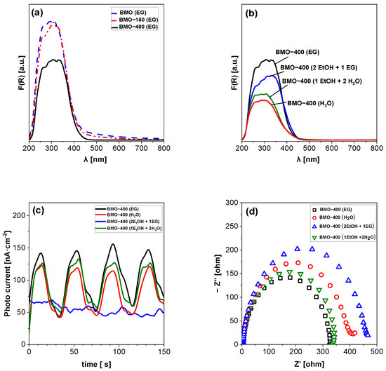 UV-Vis diffuse reflectance spectra of (a) BMO (EG) after its thermal annealing, (b) BMO synthesized with different solvents after thermal annealing at 400 °C, (c) photocurrent responses, and (d) EIS Nyquist plots of calcined BMO samples obtained under irradiation with visible light (λ = 430 nm).