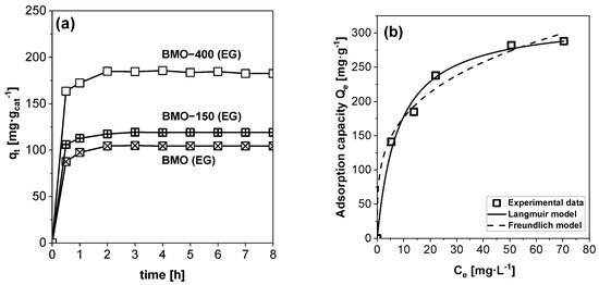 The influence of contact time on the adsorption of 2,4-D on BMO samples prepared in EG was studied at 25 °C with an initial 2,4-D concentration of 20 mg·L−1 (Figure 5a). Within the first 30 min, the adsorption process was relatively fast, which can be explained by the large number of free adsorption sites for 2,4-D molecules. Between 30 and 120 min, a slower adsorption rate was observed, and after 120 min, the adsorption/desorption equilibrium of 2,4-D was achieved on all three materials. The capacity of the material to adsorb 2,4-D increased from 100 mg·gcat−1 (as-synthesized) to 184.8 mg·gcat−1 when it was heat-treated at 400 °C. It has already been shown that organic residues can be removed from the BMO surface by the annealing process (Figure S7a), which should provide more accessible surface sites for the adsorption of 2,4-D molecules. The thermally treated BMO materials that were synthesized in other solvents as EG showed lower adsorption capacities of around 100 mg·gcat−1 (Figure S12). Another reason for the higher adsorption capacity of BMO-400 (EG) could be its higher surface carbon content (approximately 10%, Table S7). This might contribute to the fact that the surface of BMO-400 (EG) is more hydrophilic than that of BMO-400 (H2O), as shown by the lower contact angle (Figure S13). To exclude the possibility that the observed differences in adsorption are caused by differences in the BMO surface charge between the annealed samples, their zeta potential was measured (Figure S14). All annealed materials show a positive surface charge at the pH value obtained after the dissolution of 2,4-D in the aqueous phase (pH = 4.96). The differences in surface charge between the individual BMO samples are relatively small. A correlation between the surface charge and adsorption capacity could not be established, indicating that surface charge is not the main reason for the higher adsorption capacity of BMO-400 (EG).