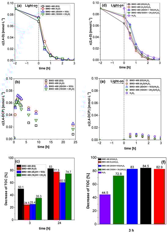 The amount of total organic carbon (TOC) in the irradiated reaction solutions was measured at specific time intervals to evaluate the efficiency of mineralization. When BMO-400 (EG) was used as the photocatalyst, less than 50% of TOC was detected in the solution after 3 h of irradiation (Figure 6c). The significant decrease in TOC when using BMO-400 (EG) is the sum of 2,4-D adsorption and its photocatalytic degradation, with 2,4-DCP as the main intermediate. When comparing the TOC removal results after 24 h, BMO-400 (EG) again shows the lowest TOC value.
