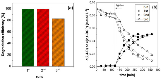 (a) Recycling runs in the photocatalytic degradation of 2,4-D with BMO-400 (EG) in small batch reactor and (b) plot of 2,4-D and 2,4-DCP concentration versus time in flow operation under recirculation (open symbols—2,4-D, filled symbols—2,4-DCP).