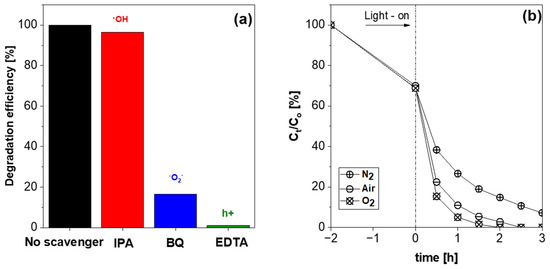 (a) Effect of scavenger on the 2,4-D degradation using blue LED light in the presence of BMO-400 (EG) after 180 min (mcat = 10 mg, C(2,4-D) = 20 mg·L−1, n(scavenger) = 0.15 mmol; (b) plot of relative 2,4-D concentration versus irradiation time using different gas atmospheres.