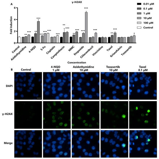 RPMI-1640, DMEM, and fetal bovine serum (FBS) were purchased from Gibco (Grand Island, NY, USA). Anti-γ-H2AX mouse monoclonal antibody (80312) and Anti-p-H3 rabbit monoclonal antibody (3458) were obtained from Cell Signaling Technology (Danvers, MA, USA). Alexa-488-labeled anti-rabbit secondary antibody (A32731) and Alexa-488-labeled anti-mouse (A32723) secondary antibody were purchased from Invitrogen (Carlsbad, CA, USA). Fluorescent probe Hoechst 33342 was obtained from Life Technologies (Carlsbad, CA, USA). A panel of genotoxic agents was sourced from Shanghai Yuanye Bio-Technology Company (Shanghai, China), including Camptothecin, Etoposide, Chlorambucil, Cisplatin, Mitomycin C, 5-Fu, Taxol, Vincristine, Griseofulvin, Tozasertib, Azidothymidine and 4-NQO.