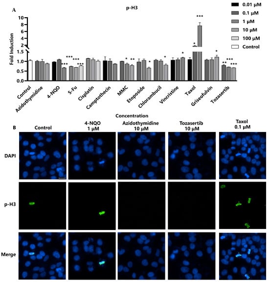 Assessment of p-H3 as a marker for DNA damage induced by aneuploid genotoxic compounds. Hep G2 cells were seeded into 96-well black-bottomed plates at a density of 1.5 × 104 cells/well and exposed to various compounds. (A) The fluorescence intensity of p-H3 in the nuclei was measured and calculated as fold induction compared with the control group. Statistical significance was determined using one-way ANOVA (* p < 0.05, ** p < 0.01, *** p < 0.001 vs. control). (B) The representative images were captured using a high-content cell analysis system. Scale bar: 20 μm.