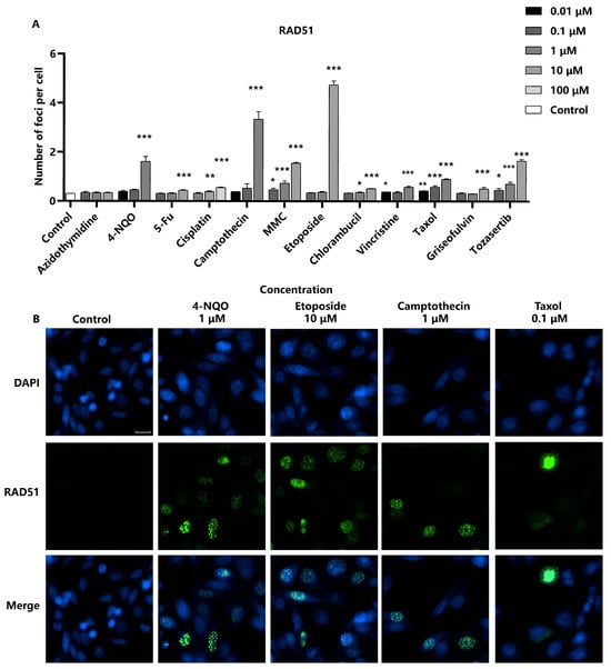 All experiments were conducted with at least three independent replications. The intensities of γ-H2AX and p-H3, as well as the number of RAD51 foci for all compounds tested, were graphically represented using GraphPad Prism 8 software (GraphPad Software, Boston, MA, USA). Given that the sample means were normally distributed, one-way analysis of variance (ANOVA) was employed for comparisons, followed by Bonferroni post hoc correction. The statistical analyses were performed using GraphPad Prism 8 (* p < 0.05; ** p < 0.01; *** p < 0.001).