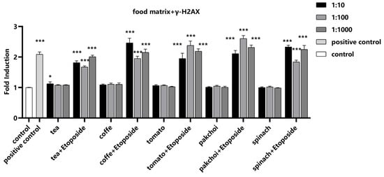 Impact of food matrices on the detection of γ-H2AX. Food matrices, including coffee, tea, pak choi, spinach, and tomato, were serially diluted to 1:10, 1:100, and 1:1000 with serum-free medium. The diluted matrices were spiked with positive control etoposide (1 μM). The fluorescence intensity of γ-H2AX was measured and calculated as fold induction compared with control group. Statistical significance was determined using one-way ANOVA (* p < 0.05, *** p < 0.001 vs. control).