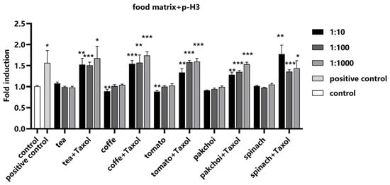 Impact of food matrices on the detection of p-H3. Food matrices, including coffee, tea, pak choi, spinach, and tomato, were serially diluted to 1:10, 1:100, and 1:1000 with serum-free medium. The diluted matrices were spiked with positive control Taxol (0.1 μM). The fluorescence intensity of p-H3 was measured and calculated as fold induction compared with control group. Statistical significance was determined using one-way ANOVA (* p < 0.05, ** p < 0.01, *** p < 0.001 vs. control).