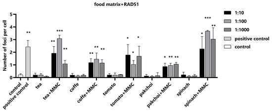 Impact of food matrices on the detection of RAD51. Food matrices, including coffee, tea, pak choi, spinach, and tomato, were serially diluted to 1:10, 1:100, and 1:1000 with serum-free medium. The diluted matrices were spiked with positive control MMC (10 μM). The average number of RAD51 foci in the nuclei per cell was measured. Statistical significance was determined using one-way ANOVA (* p < 0.05, ** p < 0.01, *** p < 0.001 vs. control).