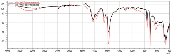 FT-IR/ATR spectrum of the obtained MIL-100(Fe). Comparison of spectra of synthesized and commercial MOFs.