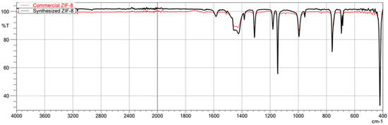 FT-IR/ATR spectrum of the obtained ZIF-8(Zn). Comparison of spectra of synthesized and commercial MOFs.
