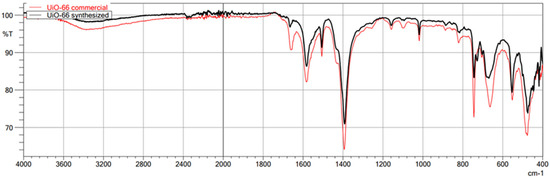 FT-IR/ATR spectrum of the obtained UiO-66(Zr). Comparison of spectra of synthesized and commercial MOFs.