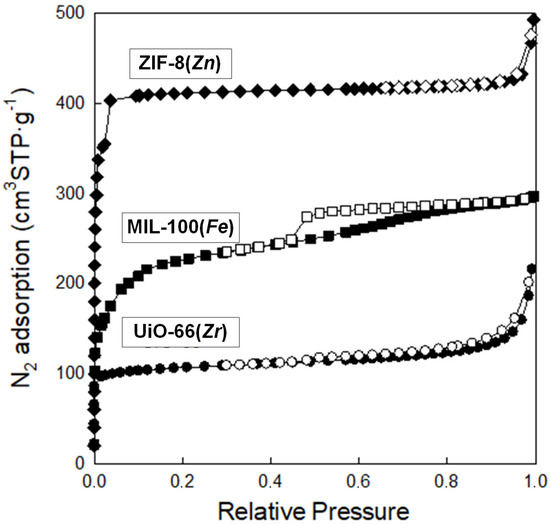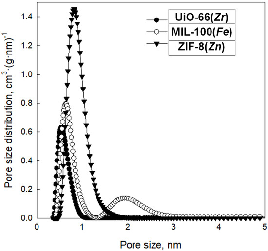 Analysis of low-temperature nitrogen adsorption isotherms was used to determine structural parameters such as specific surface area (SBET) and pore volume (Vt), as well as pore size distribution (PSD). Figure 8 shows nitrogen adsorption–desorption isotherms measured at −196 °C, and Figure 9 presents the corresponding PSD functions determined for the synthesized samples. These MOFs feature high SBET ranging from 392 to 1479 m2 g−1; the highest value features ZIF-8(Zn), with a lower value of 805 m2 g−1, possesses MIL-100(Fe), whereas the lowest value exhibits UiO-66(Zr). All MOFs show large pore volumes with most micropores in their structures; Vt of ZIF-8(Zn), MIL-100(Fe), and UiO-66(Zr) are 0.76, 0.46, and 0.33 cm3 g−1, respectively. The maxima of the PSD peaks (Figure 10), and thus the average pore sizes, determined for all samples studied, are in the microporous range, up to ~2 nm (Table 1).