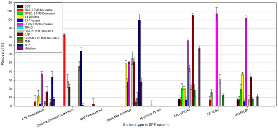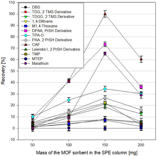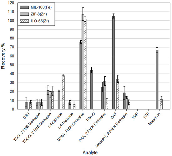 The selection of the appropriate elution solvent has a crucial impact on the process of desorption of analytes from sorbents and, thus, the recovery of compounds obtained as a result of the analysis. This experiment examined the effect of four popular organic solvents (acetonitrile, ethyl acetate, dichloromethane, and hexane) on extraction efficiency. The results for the individual solvents are ranked according to their decreasing polarity. An example of experimental data is shown in Figure 10. The results show that the highest efficiency of the extraction is achieved with the use of acetonitrile. As the polarity of the solvents used decreased, the recoveries of the analytes gradually reduced as well. The best recoveries were obtained using acetonitrile as an elution solvent for DPAA, CAP, and malathion for selected MOFs. Analyzing the received data, it can be seen that the used MOFs show the most excellent affinity for DPAA, CAP, malathion, and to a lesser extent also for TDGO, 1,4-dithiane, and 1,4-thioxane. It is also worth noting that in no case were MOFs able to extract TMP and TEP. Minor recoveries were also recorded each time for DBS and TDG.