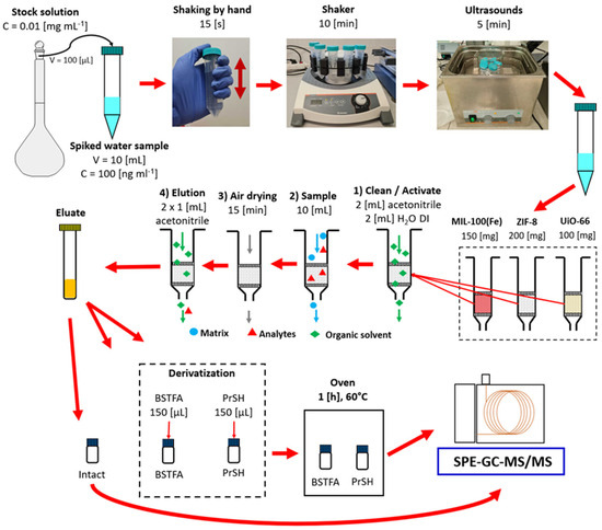 The method was optimized using spiked deionized water samples. After that, its feasibility was tested with the spiked environmental water samples from the Baltic Sea. Three parallel water samples were prepared by spiking 10 mL of deionized water with a dissolved stock solution of the test compounds dissolved in acetone, prepared in the previous step (100 µL of dissolved stock solution at 0.01 mg mL−1). Each water sample was spiked with only one standard solution, respectively, “Intact”, “BSTFA”, or “PrSH”. For example, to test the sorption character of MIL-100(Fe) against all analytes tested, it was necessary to prepare three separate samples of water spiked with the prepared solutions, “Intact”, “BSTFA”, and “PrSH”, and conduct three different analyses. The water samples were prepared in 15 mL Falcon-type plastic tubes. After spiking, the tubes were shaken manually for 15 s; then, a shaker was used for 10 min, and finally, they were subjected to an ultrasound for 5 min. Samples prepared this way were immediately subjected to further analysis using the SPE technique. An example of a sample preparation scheme is shown in Figure 1.