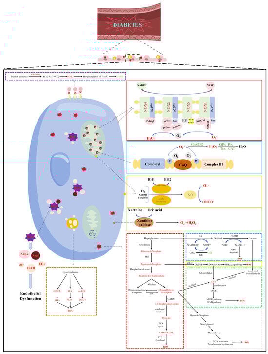 Excess superoxide leads to the release of Fe2+ by ferritin and iron–sulfur cluster-containing proteins. The increased Fe2+ produces highly reactive OH− and OH·, which is referred to as Fenton’s reaction or ferroptosis [7]. Recent research has shown that ferroptosis contributes significantly to the development of diabetes and its complications [48]. In HUVECs stimulated with HG and interleukin 1β (IL-1β), Luo and colleagues treated cells with deferoxamine and ferrostatin-1, demonstrating that ferroptosis inhibitors reduce lipid peroxides and improve endothelial cell viability. Mechanistically, HG and IL-1β enhanced HUVEC ferroptosis by activating the p53/xCT/GSH pathways. Moreover, a reduction in xCT and endothelial cell content was observed in the aorta of diabetic mice [49]. The main sources of ROS are depicted in Figure 1.