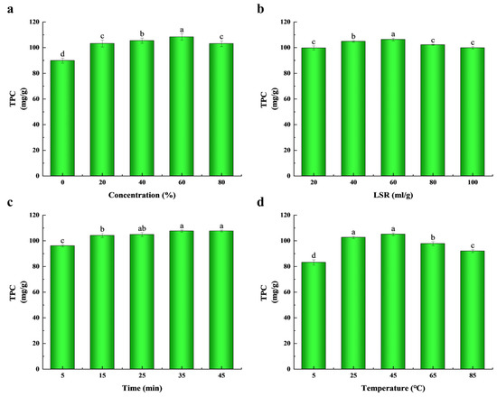 TSP extraction yield was affected by ethanol content (a), liquid–solid ratio (LSR) (b), extraction time (c) and extraction temperature (d). Data are expressed as mean ± standard deviation (n = 3). Different lowercase letters (a–d) in the graphs indicated statistically significant differences (p < 0.05).
