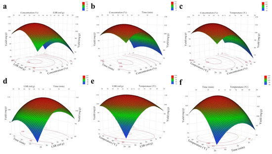 Response surface plots and contour plots for the interactions of various factors on the TSP yield. (a) Ethanol concentration and liquid–solid ratio, (b) ethanol concentration and extraction time, (c), ethanol concentration and extraction temperature, (d) liquid–solid ratio and extraction time, (e) liquid–solid ratio and extraction temperature and (f) extraction temperature and extraction time.