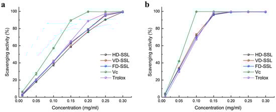 Scavenging activity of the phenolic compound extracts from T. sebifera leaves. (a) DPPH scavenging activity. (b) ABTS scavenging activity. Each value is the mean ± SD of triplicate measurements.