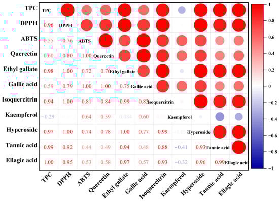 Correlation heat map analysis of TPC, quercetin, ethyl gallate, gallic acid, isoquercitrin, kaempferol, hyperoside, tannic acid, ellagic acid and in vitro antioxidant activities.