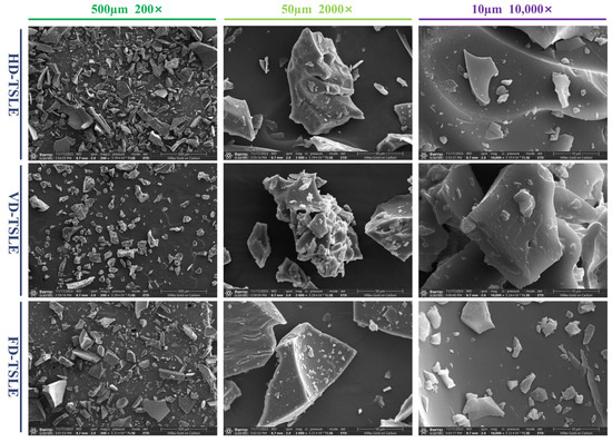 Scanning electron microscopy (SEM) is a common method for observing the surface morphology of coarse matter in the micron and submicron range [45]. The microscopic morphology of HD-TSLE, VD-TSLE and FD-TSLE at different magnifications (×200, ×2000, and ×10,000) is shown in Figure 5, and significant differences were found. It can be seen that HD-TSLE has overall sharp and long strip-shaped particles with larger surface attachments, VD-TSLE has an overall rounded shape with more surface attachments and FD-TSLE is overall square with many grooves on the surface. These structural differences affect the antioxidant activity of the phenolic compound extracts from T. sebifera leaves (Figure 3). The structure of particles can impact the wettability and solubility of extracts, which are key indexes to the development of instant soluble samples [46]. Therefore, compared with HD-TSLE, the minimum particle size and loose structure of VD-TSLE are favorable for the development of instant soluble products, and the lower processing temperature of FD-TSLE is favorable for maintaining better antioxidant activity. The present study of different drying pretreatments to obtain the phenolic compound extracts provides practical information for drying pretreatments, which will be convenient for commercial applications.